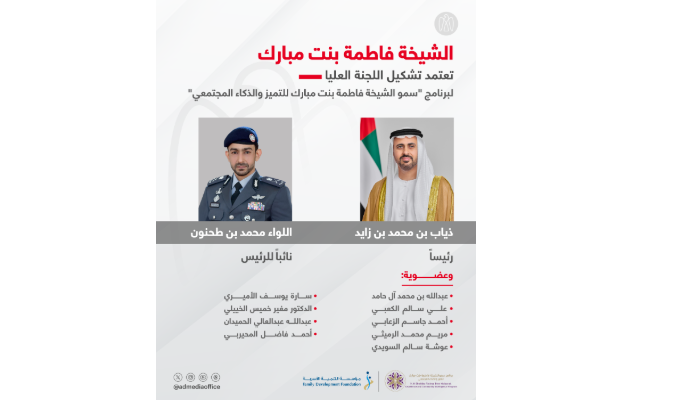 سموّ الشيخة فاطمة بنت مبارك تعتمد تشكيل اللجنة العليا للدورة الثامنة من برنامج "سمو الشيخة فاطمة بنت مبارك للتميز والذكاء المجتمعي"، برئاسة ذياب بن محمد بن زايد، واللواء محمد بن طحنون نائباً للرئيس. وتضم اللجنة في عضويتها كلاً من عبدالله بن محمد آل حامد، سارة يوسف الأميري، علي سالم الكعبي، الدكتور مغير خميس الخييلي، أحمد جاسم الزعابي، عبدالله عبدالعالي الحميدان، مريم محمد الرميثي، أحمد فاضل المحيربي، وعوشة سالم السويدي.